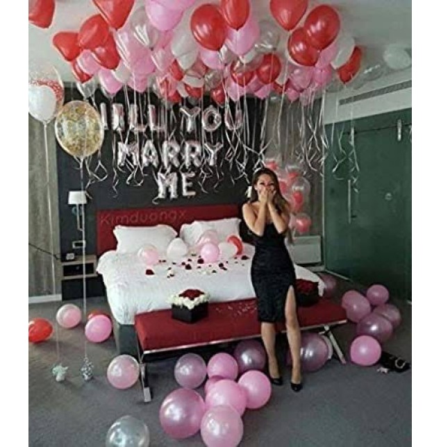A room of airfilled balloons and will you marry me balloon alpahbets