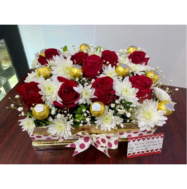 Red roses , chrysanthemums and chocolates combined to make a sweet gift !