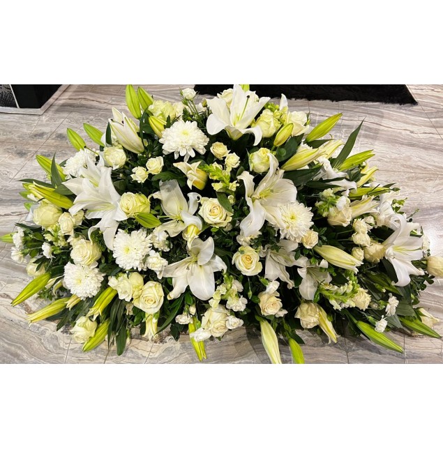 A large casket top arrangement with roses, lilies and chrysanthemums. Ideal for memorials and burials , this is a classic tribute to those remembered.