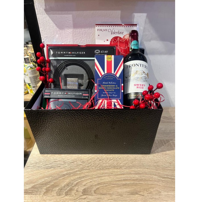 A well packaged hamper for Him with:* Tommy Hilfiger leather belt set* Tommy Hilfiger leather wallet..