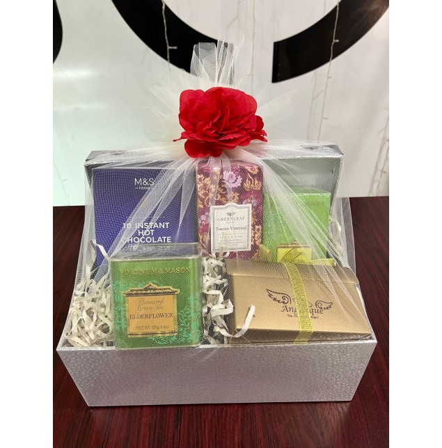 • A  hamper containing hot chocolate satchets or cappucino satchets,  a 400 gram box of Angelique gourmet chocolates, gourmet tea variants and a diffuser.