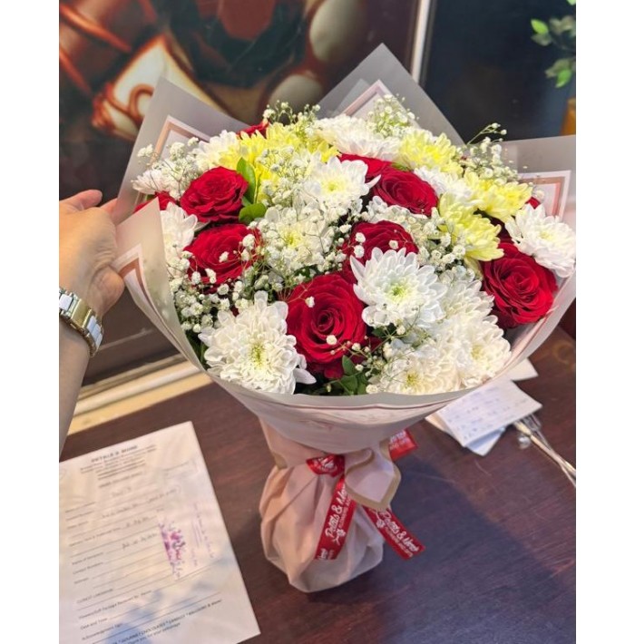 A mixed flower bouquet with 12 red roses and 2 white chrysanthemums and baby's breath..