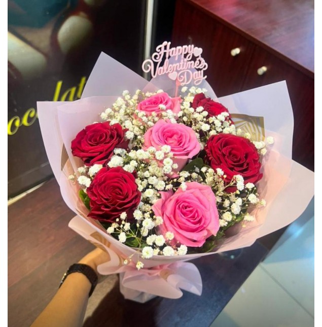 A bouquet of 7 roses (4 red and 3 pink) with baby's breath