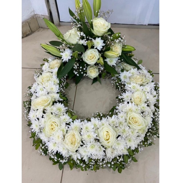 ₦ 280,000.00A 22 inch fresh flower wreath with white roses , white lilies , white chrysanthemums and baby's breath